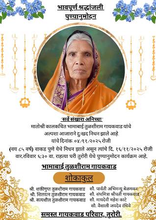 सभी शुभचिंतकों — पार्वती अभिमन्यु बेलमकर, शक्ति गुप्त, तुळशीराम शिल रत्न गायकवाड, संगमित्राताई श्रीपति गायकवाड, सत्यशील तुळशीराम गायकवाड, मायादेवी महेश काटे, वैशाली जयदेव रणदिवे सहित सभी परिजन, समर्थक और सामाजिक बंधुजनों से निवेदन है कि वे इस कार्यक्रम में उपस्थित होकर दिवंगत आत्मा को श्रद्धांजलि अर्पित करें और परिवार को इस दुखद घड़ी में संबल प्रदान करें।
